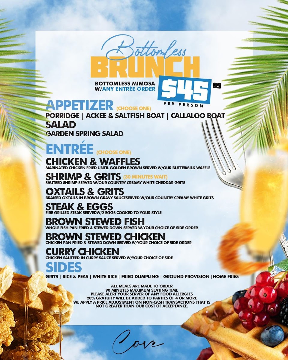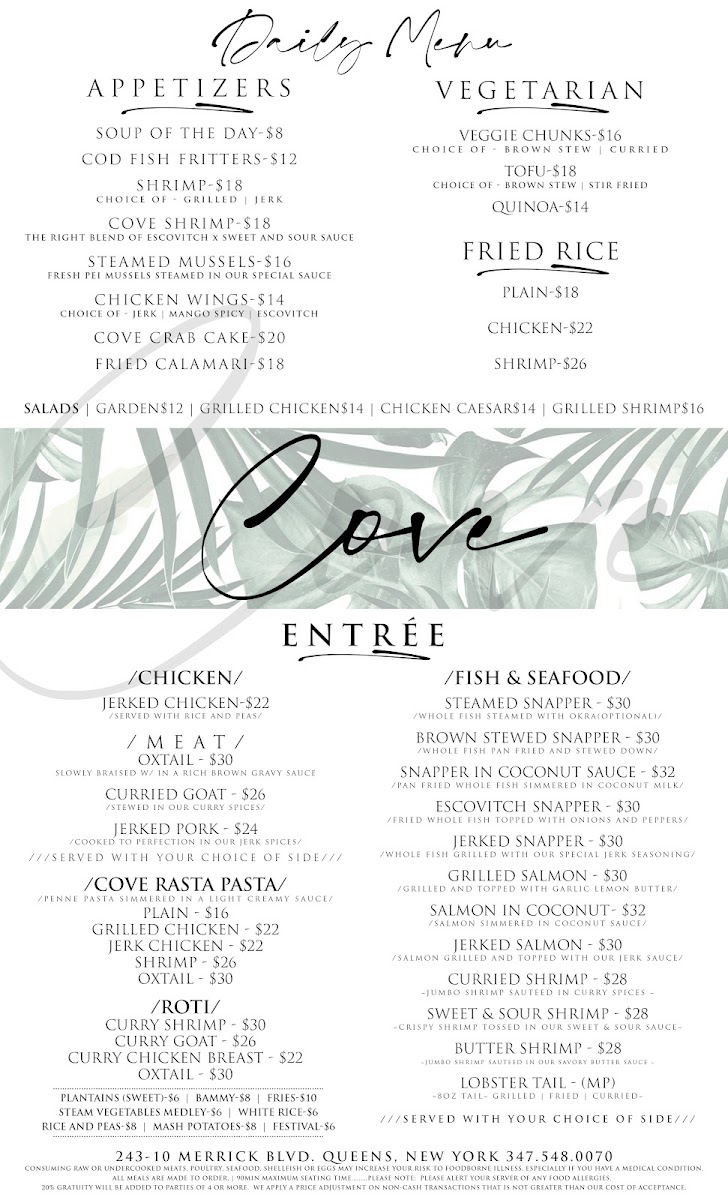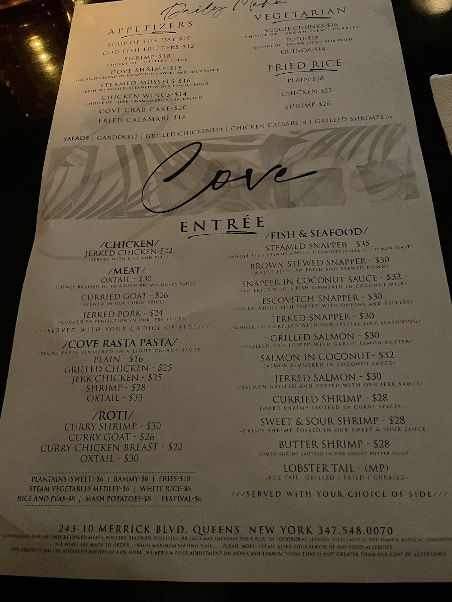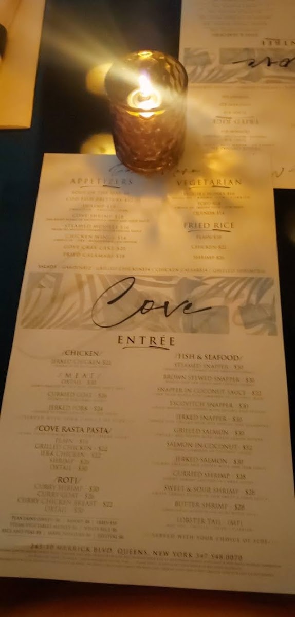 Welcome to Cove Restaurant, a culinary gem nestled in Rosedale, NY. From the moment you step inside, you’re enveloped in a vibrant ambiance enhanced by great music and friendly service. The menu is a delightful reflection of Caribbean flavors, featuring standout dishes like escovitch wings, jerk chicken, and salmon in coconut sauce. Diners rave about the calamari and curry goat as perfect starters that set the tone for an unforgettable meal.